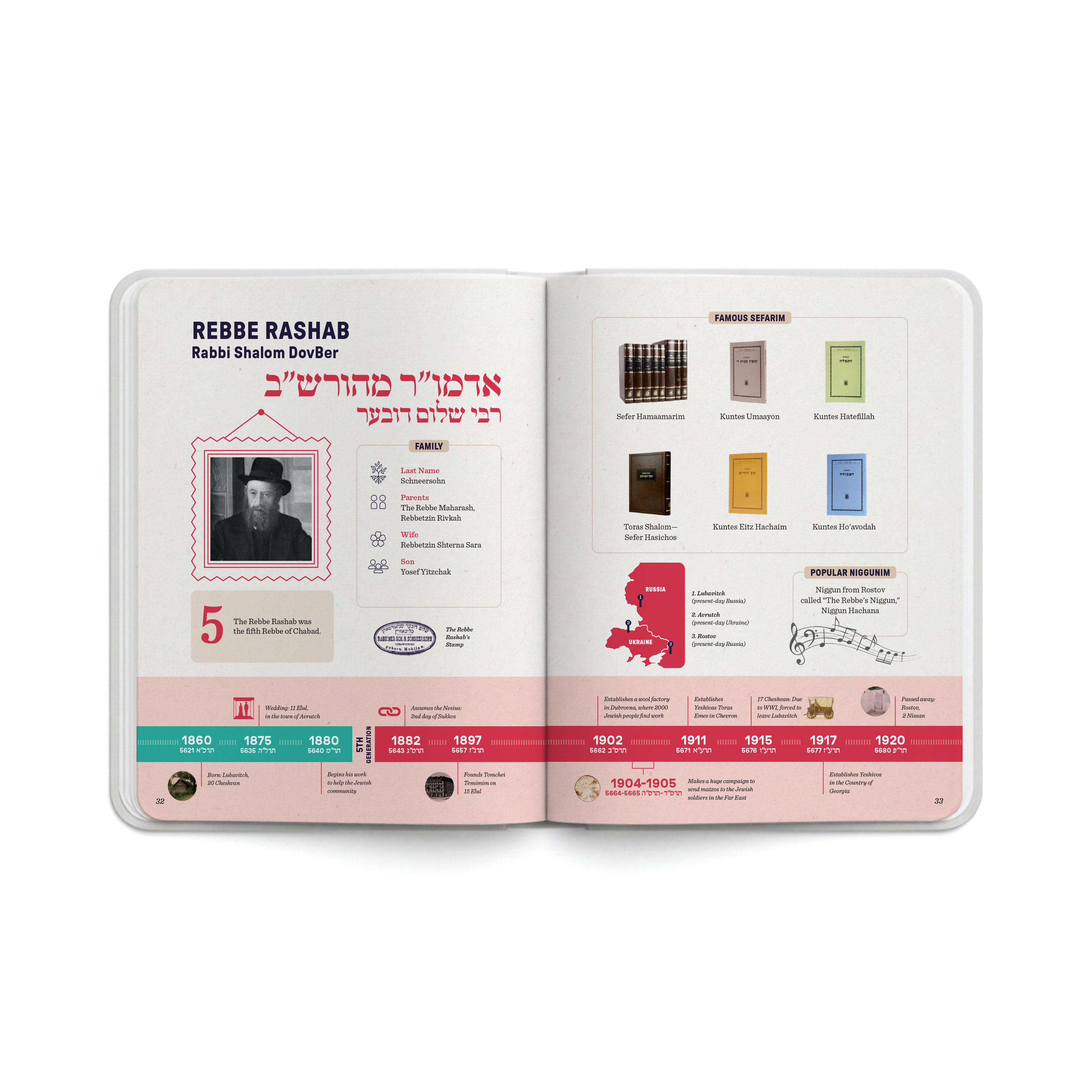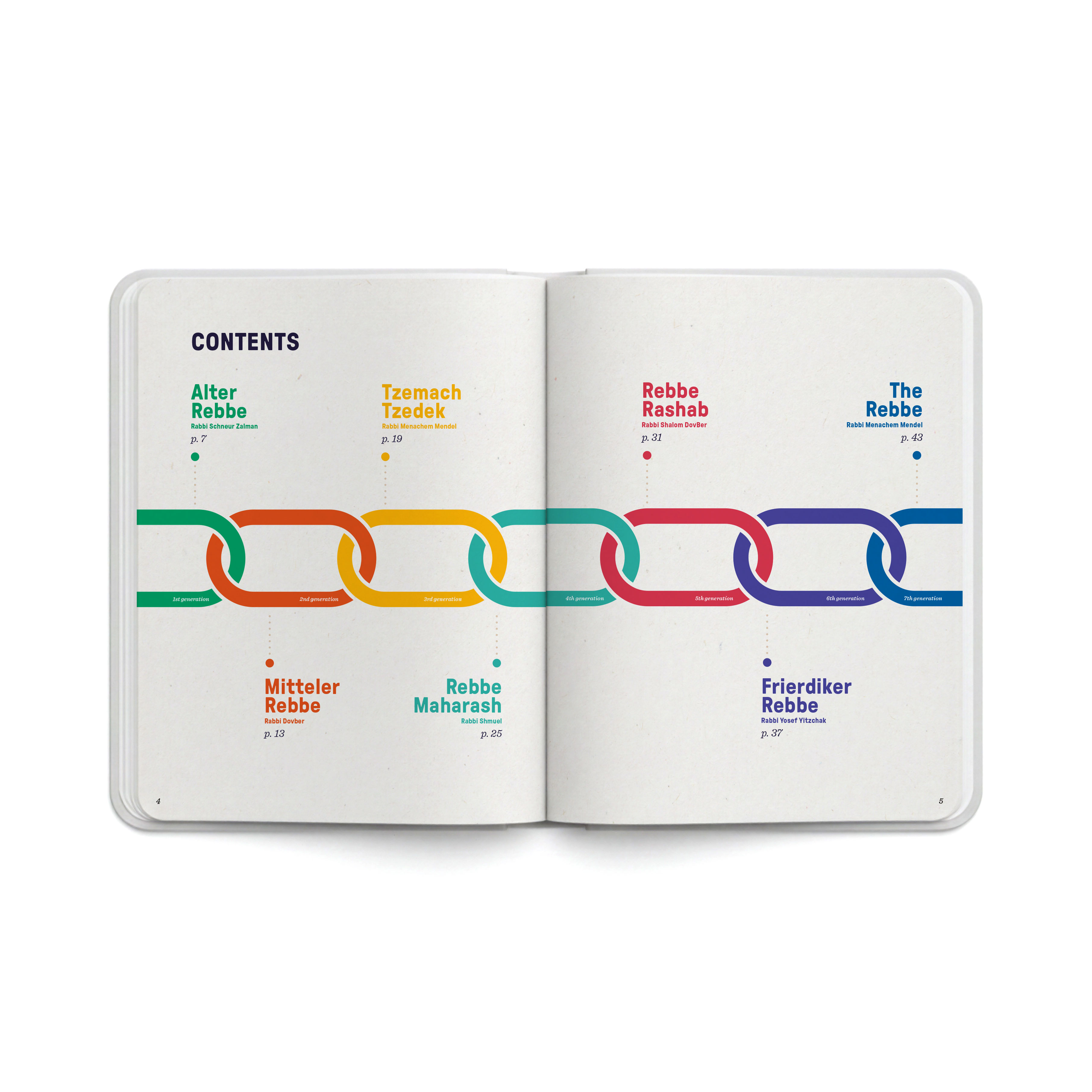 DISCOVER the chain of the Chabad Rebbes in this engaging resource, ideal for children, families, and classrooms alike. With timelines, family connections, stories, facts and figures, this book offers an accessible and structured introduction to the seven Rebbes and their leadership, from the Alter Rebbe, R. Schneur Zalman of Liadi, to the Lubavitcher Rebbe, R. Menachem M. Schneerson.